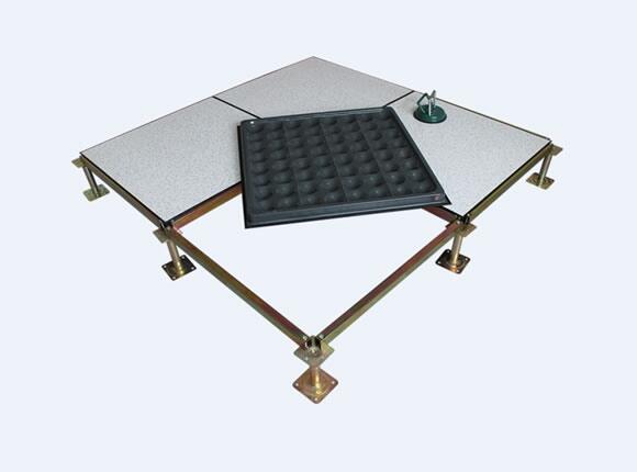 系统有地板、横梁、支座组成。提供高承载防静电工作面和下部铺设各种线路的空间。地板上配走线盒,为各种电器设备、办公设备提供电器、数据插座、走线口。横梁和自身高度可调整的支座用螺丝钉连接成稳固的下部支撑系统,地板镶嵌入横梁围成的方格内。