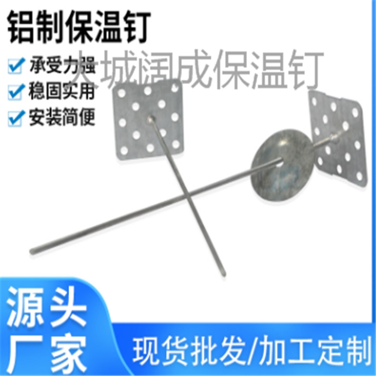 铝制保温钉、多孔保温钉、不干胶保温钉由马口铁、铝丝经机械加工而成,热性能优于塑料保温钉 ,与保温钉专用胶结合使用,广泛用于建筑岩棉保温、中央空调、通风管道的保温工程,其性能优越,施工方便,根据施工保温层的厚度要求分为多种规格,