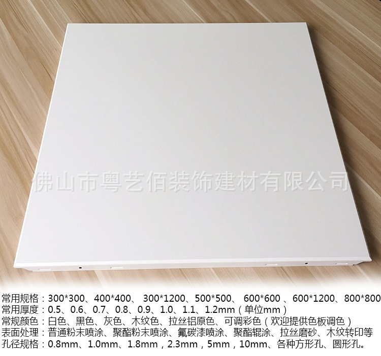 粤艺佰方形铝扣板根据吊顶安装方式不同通分为明龙骨安装铝扣板和暗龙骨安装铝扣板。一般采用较多的款式为暗龙骨安装方式。粤艺佰常用的铝扣板板面款式分为平面铝扣板及微孔铝扣板两种,微孔孔型有圆孔、方孔、长圆孔、长方孔、三角孔、大小组合孔及其他图案冲孔等,客户可根据具不同的风格及设计要求随意选择。