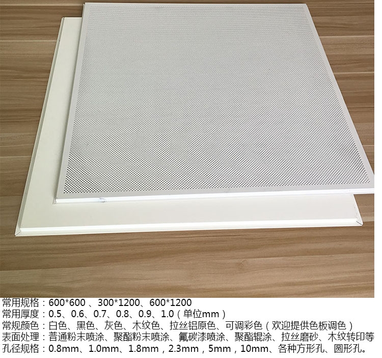 工程常规规格:600*600mm、800*800mm、 300*1200mm、600*1200mm 铝扣板规格有长条形和方块形、长方形等多种,颜色也较多,因此吊顶中有很多的选择余地的长条形规方块形的常用规格有300*300,600*600多种,小面积多采用300*300,大面积多采用600*600。为使吊顶看起来更美观,可以将宽窄搭配,两种颜色组合搭配。铝扣板的厚度有0.4、0.6、0.8㎜等多种,越厚的铝扣板越平整,使用年限也就越长。灰色铝扣板