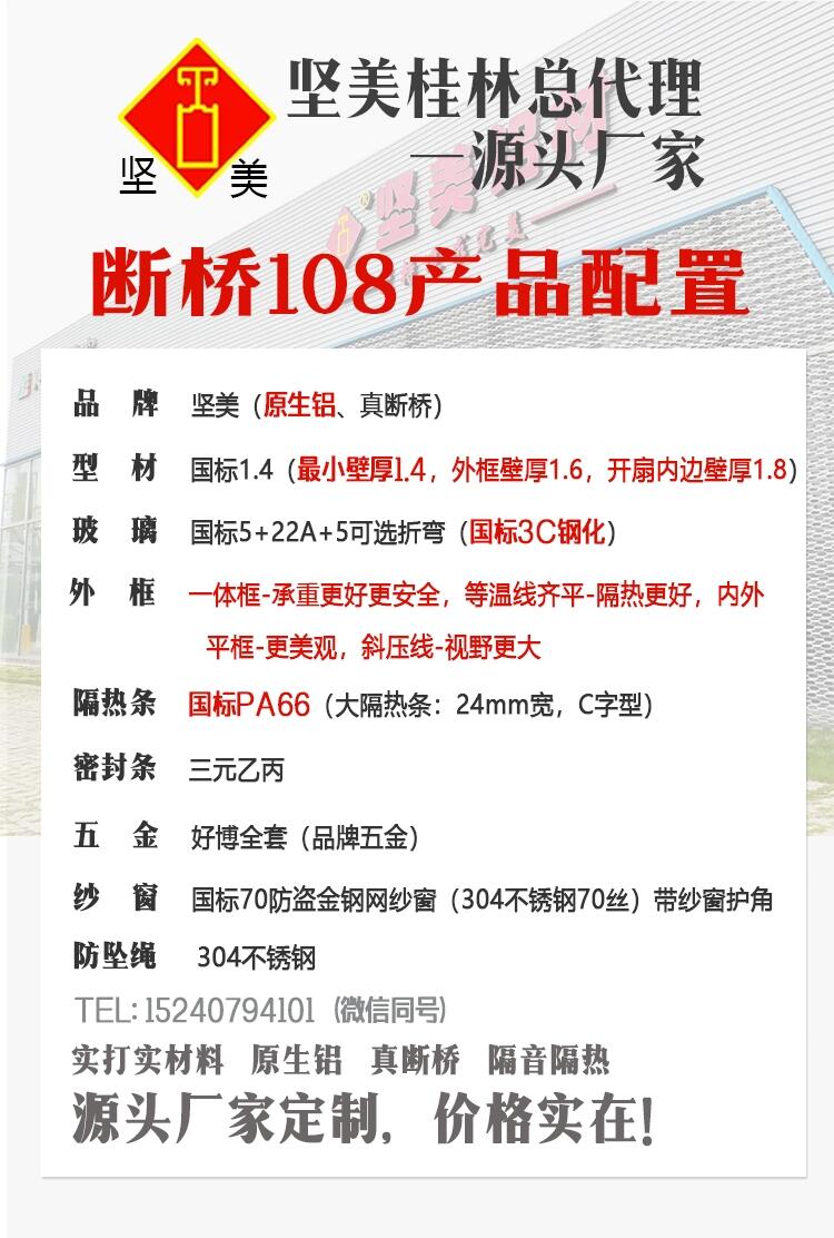 地图搜索:坚美桂林总代理,直接导航到厂。2、型材:国标1.4(最小壁厚1.4,外框壁厚1.6,开扇内边壁厚1.8),