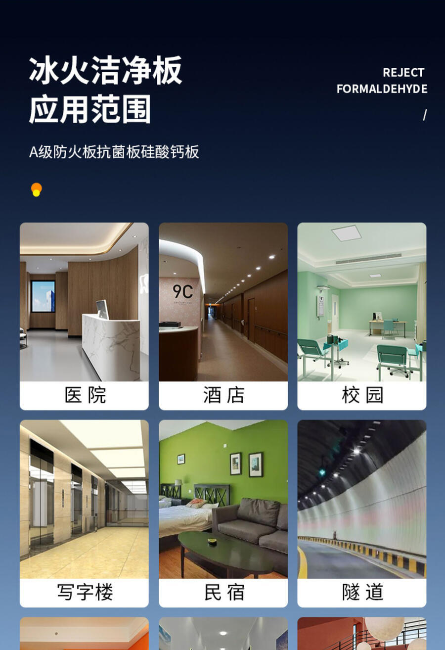 广泛应用于地铁、医院、隧道、学校、体育场馆、洗衣房、办公楼等内外墙各大领域场所。潮湿处更能显示其优秀性能,如厨房、卫生间、阳台等。无机预涂板,又称洁净板、防火板、抗贝特板以100%无石棉的硅酸钙板为基材以100%无石棉的地铁、医院、隧道、学校板为基材,新型装饰材料履涂特殊聚酯进行表面处理,使其具有有效的防火性,抗老化性、耐水性,保持亮丽的外观,给人以清洁感。