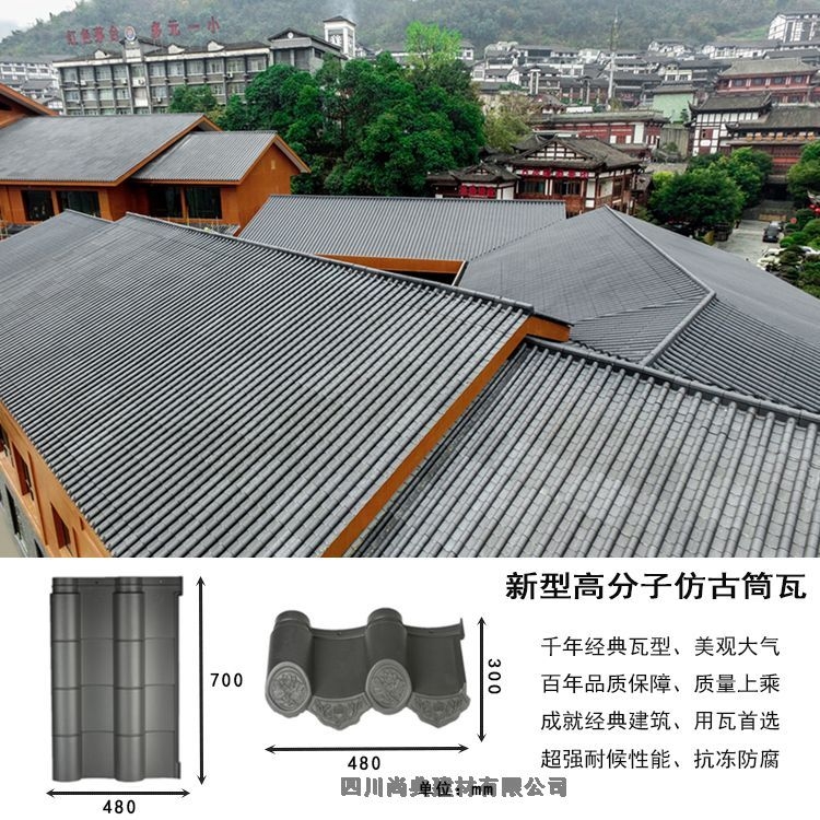 成都高分子筒瓦造型既传承了烧结青筒瓦及烧结小青瓦的古朴典雅风格,又有西式瓦充满欧式风情的现代气息,是传统建筑文化元素与现代材质和工艺的完美融合。