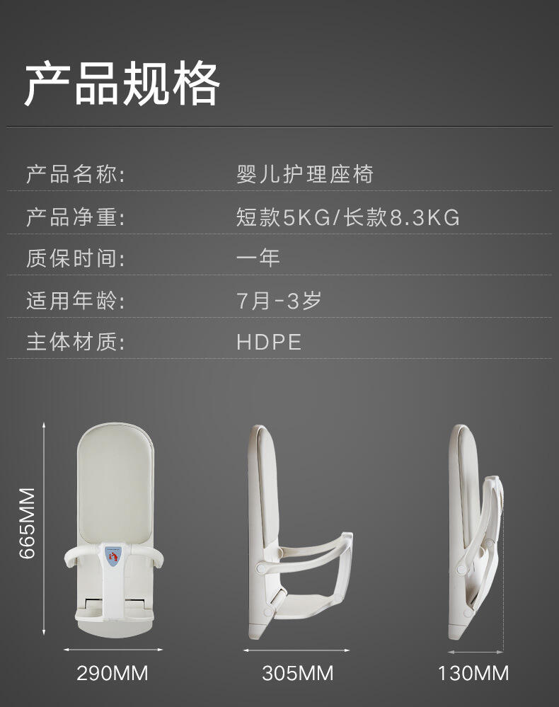 用于公共场所:商场、火车站、公共洗手间、机场、火车、飞机等地方的人性化产品,解决了婴儿出门没地方换尿布的困惑和麻烦,更为带婴儿的父母提供便捷安全的婴儿换尿布平台。 平滑流物的合页系统及不可视的轴杆设计能更好地保护宝宝,降低宝宝皮肤被夹的危险;角板支持装置增强此台的力量和稳定 婴儿护理台主要是在公共场所装置的便捷设备,又叫婴儿打理台,婴儿换尿布台,婴儿尿布台等。它可以提供父母和宝宝温馨的服务,在顾客需要给孩子整理衣服、换尿布时,可将婴儿平放在整理台上面,方便母亲为宝宝换尿。婴儿整理台采用抗霉、抗菌之高品质材质一体成型,特殊圆角设计,安全可靠。台面宽大,配有可调整的安全带,既方便了带婴儿出游的妈妈,也让环境卫生有了基本保证条件。在发达国家,婴儿护理台已经成为公共卫生间的标配产品,随着国内卫生间设计的逐步完善,婴儿护理台也将被越来越多使用者接受并采纳。中文名: 婴儿安全座椅
