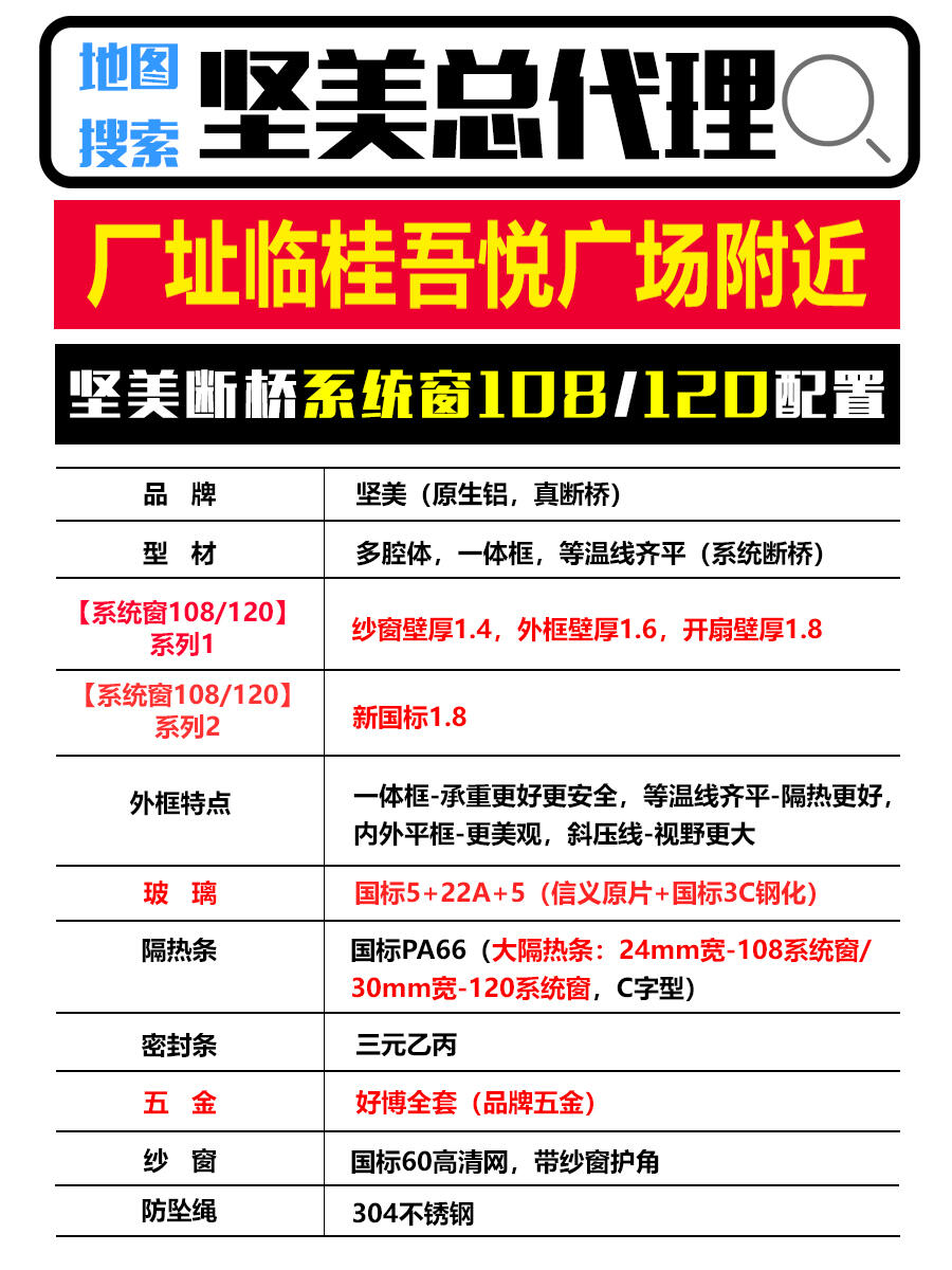 【坚美·断桥系统窗108/120(原生铝)】配置: