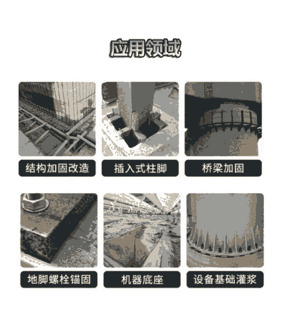 灌浆料主要用于:地脚螺栓锚固、飞机跑道的抢修、核电设备的固定、路桥工程的加固、机器底座、钢结构与地基杯口、设备基础的二次灌浆、栽埋钢筋、混凝土结构加固和改造、旧混凝土结构的裂缝治理,机电设备安装,轨道及钢结构安装,静力压桩工程封桩,建筑加固,梁柱截面加大、墙体结构的加厚及漏渗水的修复,各种基础工程的塌陷灌浆以及各种抢修工程等。
