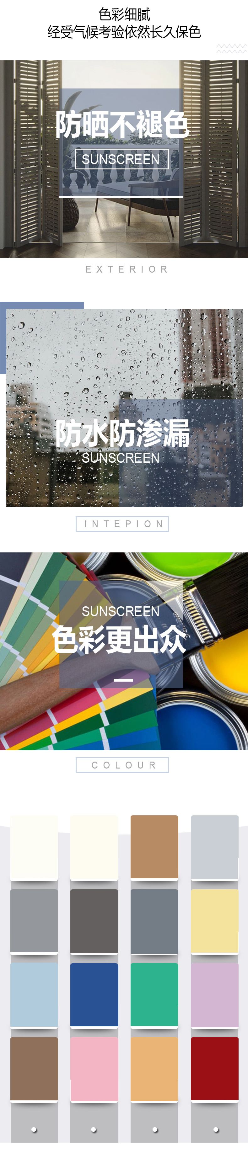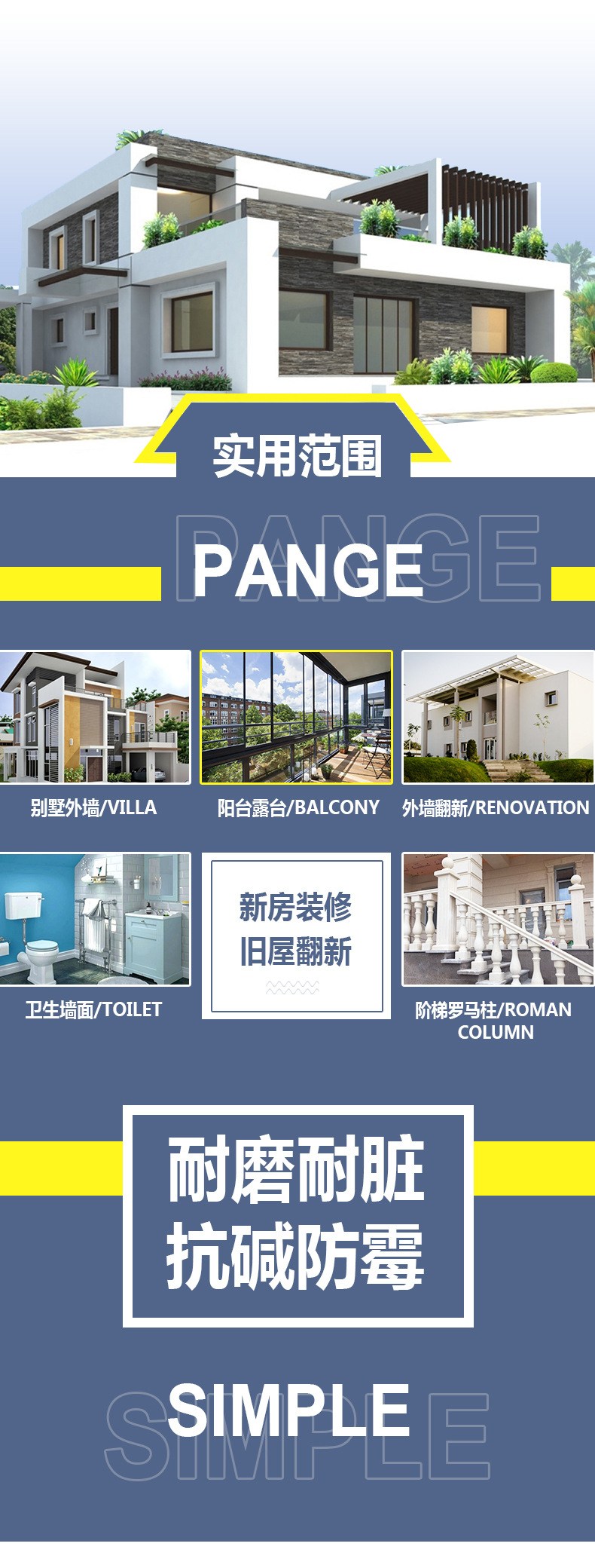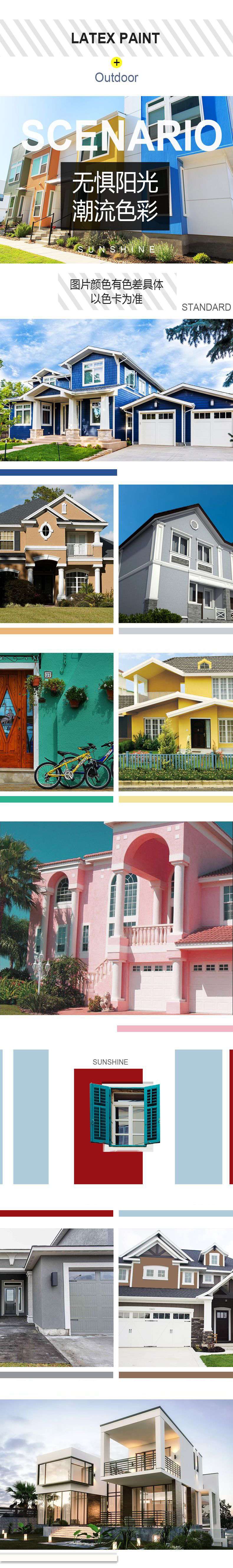 外墙涂料适用于住宅、酒店、办公楼、学校等大型建筑物外墙新建及翻修工程。用于混凝土、水泥砂浆、砖墙、预涂底漆的金属件及木制品等多种结构表面的半装饰及保护。对未结露面墙,可在5℃情况下施工。适合于污染的城市外墙涂装工程。