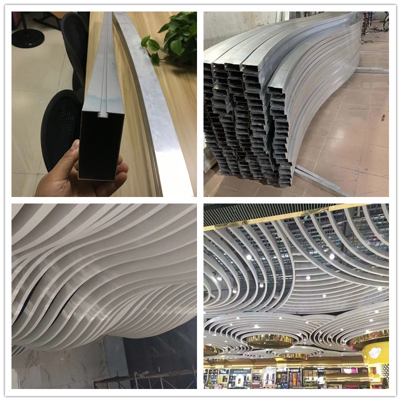 另一种为不经过时效的型材铝管或O态材质铝板加工的U槽型铝方通经过弯弧机器的拉弯,形成各种弧形的C型、S型以及其他曲率弧形的铝方通,再用拉弯机进行拉弯处理,拉出各种弧度的弧形铝方通。通过各种弧度的弧形铝方通构造出不同造型的波浪型吊顶,或者其他形状的吊顶方式。