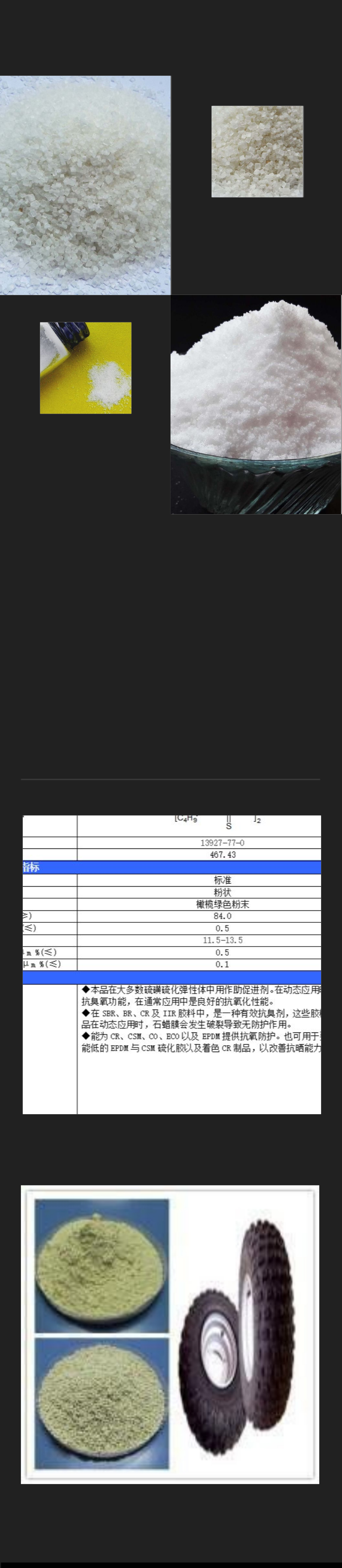 产品特性 | 在大多数硫磺硫化弹性体中用作助促进剂。在动态应用时提供有效抗臭氧功能,在通常应用中是良好的抗氧化性能。在SBR、BR、CR及IIR胶料中,NDBC是一种有效抗臭剂,这些胶料制成的产品在动态应用时,石蜡膜会发生破裂导致无防护作用。 | ||