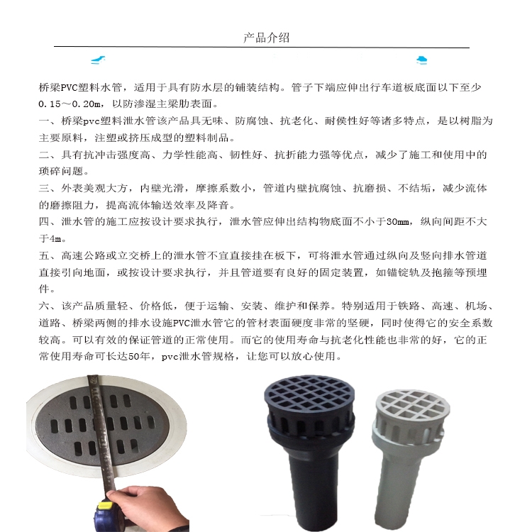 六、该产品质量轻、价格低,便于运输、安装、维护和保养。特别适用于铁路、高速、机场、道路、桥梁两侧的排水设施PVC泄水管它的管材表面硬度非常的坚硬,同时使得它的安全系数较高。可以有效的保证管道的正常使用。而它的使用寿命与抗老化性能也非常的好,它的正常使用寿命可长达50年,pvc泄水管规格,让您可以放心使用。