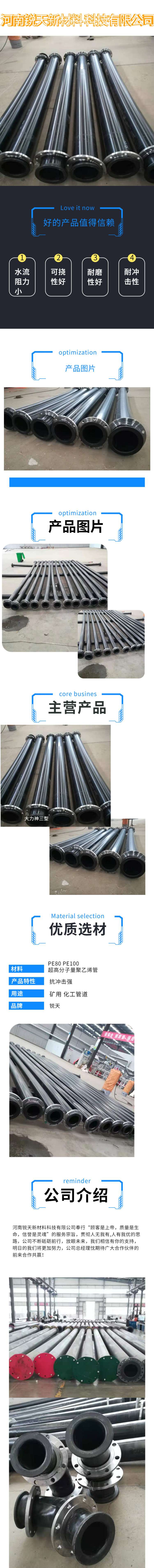 产品特性描述:高分子量聚乙烯管道(UHMW-PE)是由乙烯、丁二烯单体在催化剂的作用下,聚合而成 的平均分子量大于200万的热塑性工程塑料。该材料综合性能优越,耐磨损、耐低温、耐腐蚀、自身润滑、抗冲击性能在所有塑料中为高值,耐磨性能优于聚四 氟乙烯、尼龙、碳钢等材料,可长期在-169至+80℃条件下工作,被称为"令人惊异"的工程塑料,它几乎集中了各种塑料的优点,耐磨抗冲击,自润滑,耐腐蚀、耐低温、卫生无毒、 不粘附、不吸水等综合性能,是一种较为理想的管材。