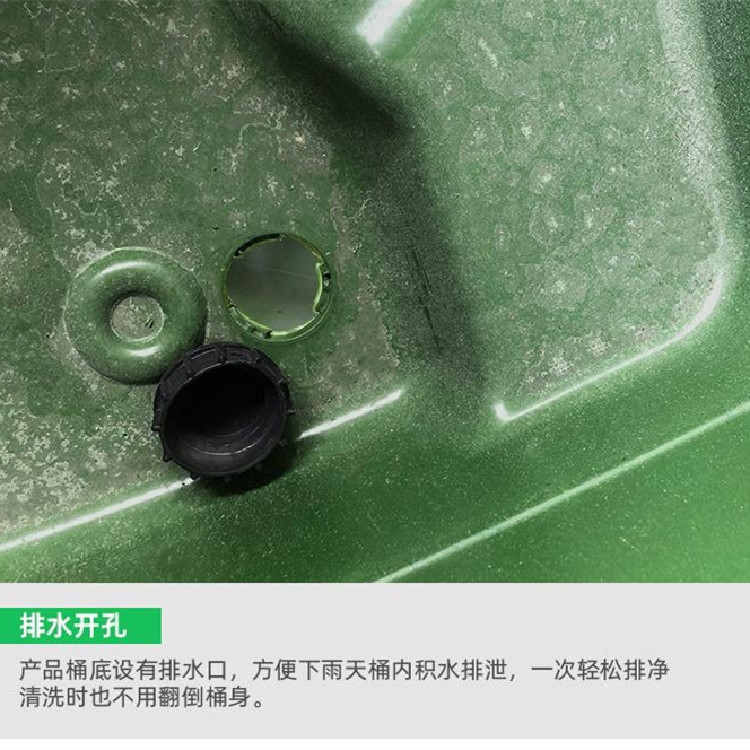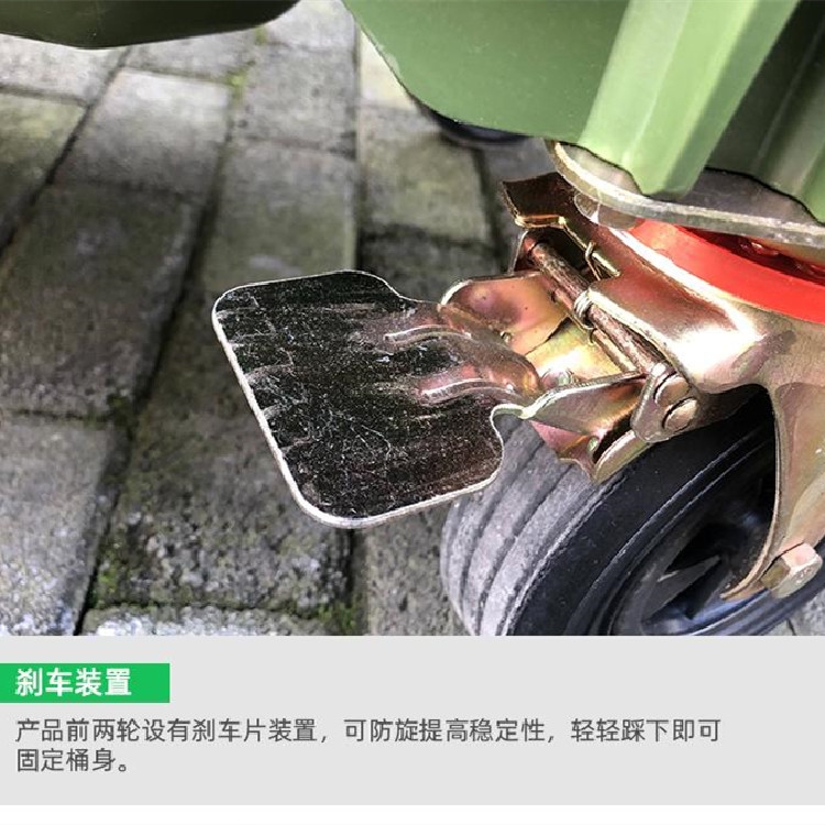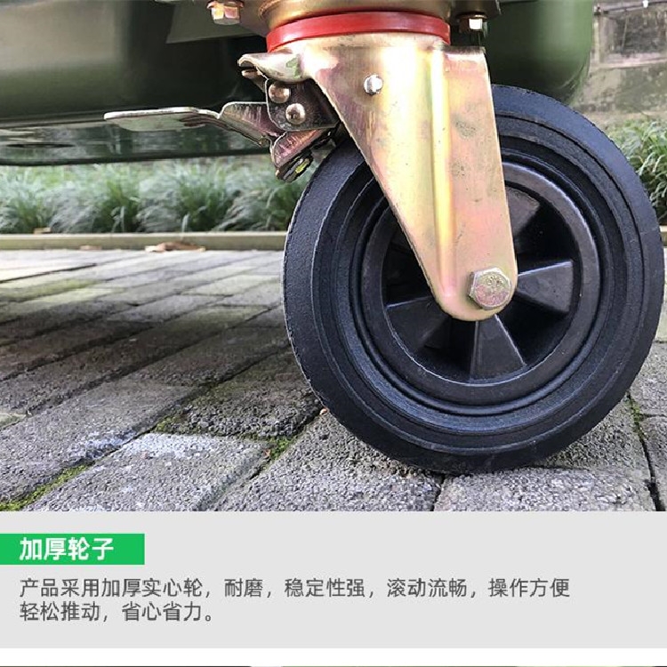 4、每只垃圾桶均装有轮胎,您无需再行购置小垃圾车,更节省费用。