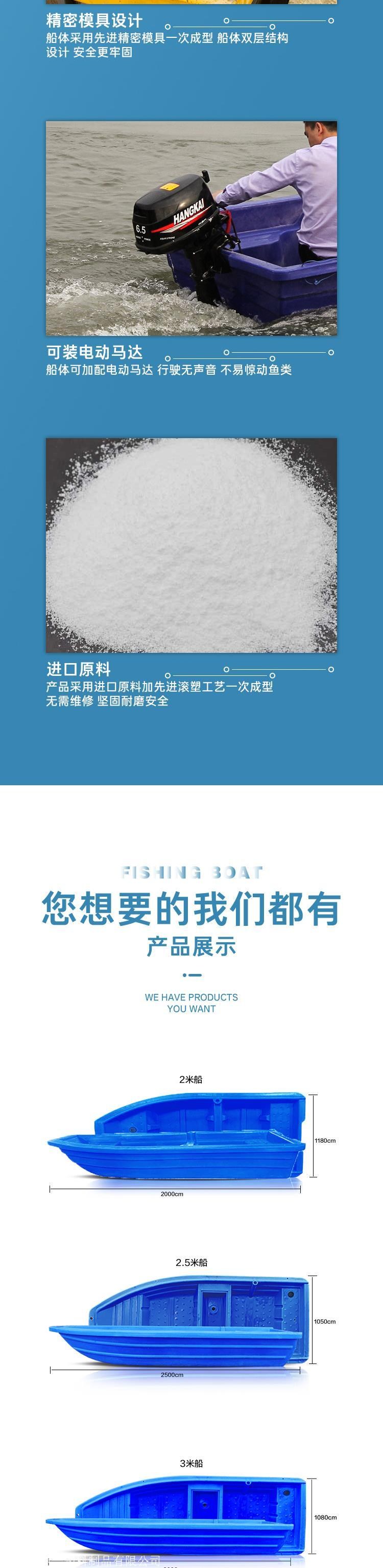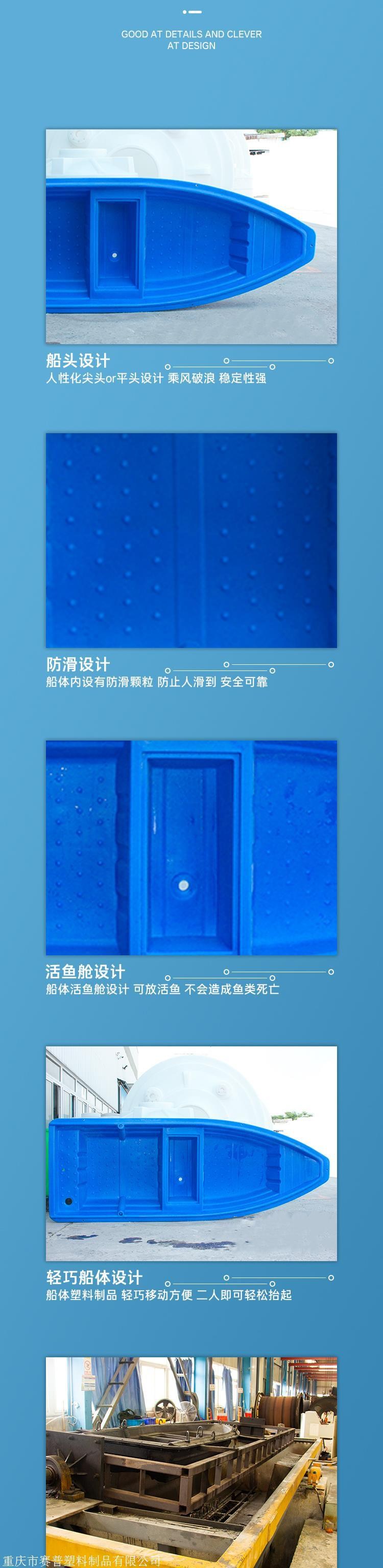 塑料渔船产品优势:  一,采用国内先进的滚塑技术,产品一次成型,船体为双层机构制造,更加牢固。 二,耐各种水质侵蚀,如海水污水,表面光滑,使用后清水一冲就干净,船体轻巧,不易碰伤人的身体,安全可靠,靠电动马达行使轻松省电。 三,塑料制品船体轻,移动方便,二人能轻松抬起。 四,可以安装电动马达,行使时无声音,不易惊动鱼类。 五,船体表面采用防滑设计,不过提醒广大亲们在船上行走时注意安全。