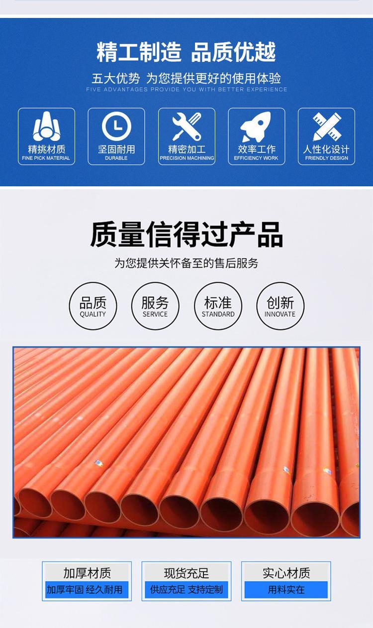 2、MPP电力管,橘红色,电力电缆保护管、MPP电缆保护管。开挖型和非开挖型,MPP非开挖型电力管又称做MPP拖拉管;