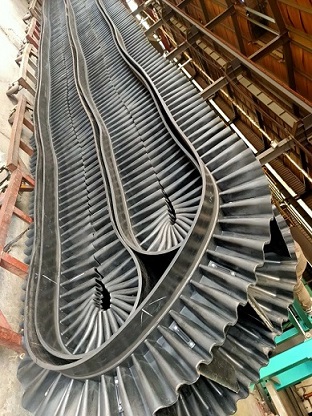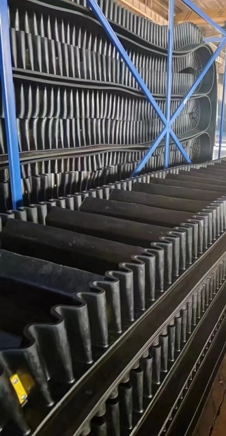 炜泰大倾角裙边隔板带由基带、挡边、横隔板三部分组成。挡边起防止物料测滑撒落的作用。橡胶皮带当中大倾角挡边带是橡胶输送带当中技术含量非常高的一种特殊产品,而它的隔板部分对于硬度、磨耗、挺性等指标要求非常高大倾角挡边带隔板,其具有高硬度、耐磨、表面光滑不粘物料,使用寿命长的优点。挡边输送带可沿水平、倾斜、垂直和变角方向输送各种散装物料,无论是煤、矿石、沙子还是化肥和粮食等。400mm粒度以下粒度不限,输送量可从1m 3 /小时至6000m3/小时任选。基带的要求:挡边输送带基带要求具有一定的抗拉强度和耐磨性。其中对留有空边的挡边输送带,为了适应角度该向的要求,胶带的纵向要有柔软性,横向则要求一定的刚性。公司生产的挡边输送带采用特殊结构的横向刚性基带,解决了大规格输送带在回程过程塌带现象。基带的构造:基带是由上覆盖胶、下覆盖胶、带芯和横向刚性层四部分组成。上覆盖胶厚度一般为3-6mm;下覆盖胶厚度一般为1.5-4.5mm,带芯材料承受拉力,其材料可以是棉帆布(CC)、尼龙帆布(NN)、聚酯帆布(EP)或刚绳芯(ST)。为了增加基带的横行刚性,在芯体上、上假如特殊加强层,称横向刚性层。基带的宽度规格,与普通胶带相同波形挡边输送带被广泛引用与港口、冶金、矿山、电力、煤炭、铸造、建材、粮食