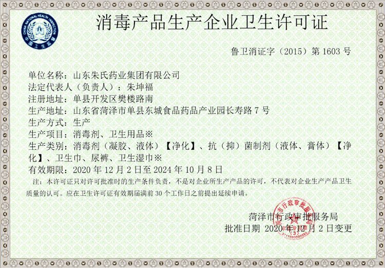 生产企业卫生许可证号 | 鲁卫消证字(2015)第1603号 | ||