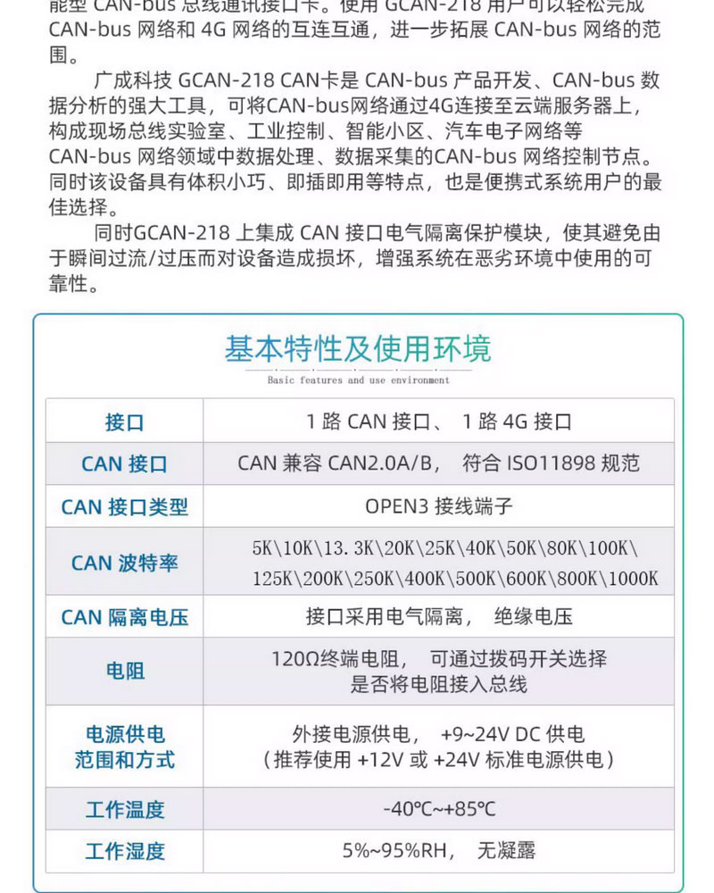 广成4G转CANBUS网关GCAN-218 适用LTE-FDD B1/B3/B5/B8频段 隔离保护 型号 | GCAN-218 | ||
