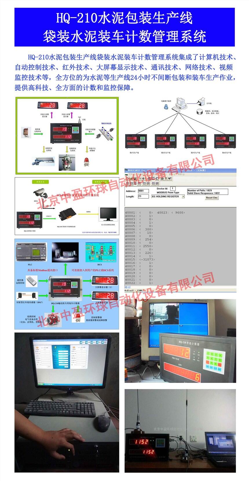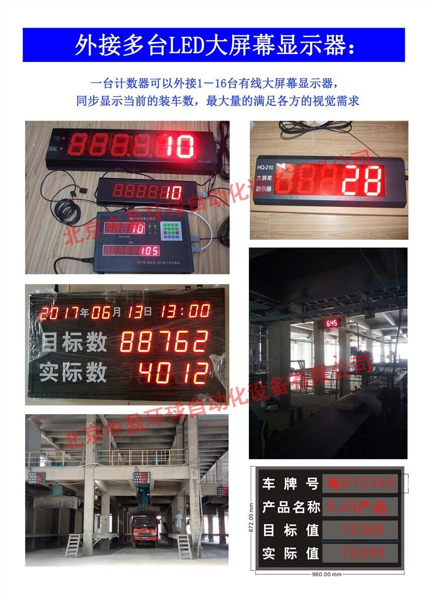 HQ-210智能水泥计数器,不仅仅具备了水泥行业的标准要求(实时显示装车数量和总累计数量,可设定包数,提前量提醒,连锁控制包装机或皮带机,外接大屏幕显示器,无线遥控器控制),而且根据用户的需求不同,我们给用户提供了多种应用方案:现场应用方案、计数器有线连接电脑集中控制方案、大屏幕看板现场显示、无线联网方案、计数器与视频监控一体化方案、计数器直接接入到用户中控DCS方案等等。