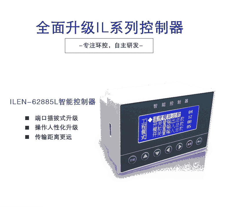 升级版IL系列微电脑智能控制器是一种通用型环境控制器,集采集、显示、控制、记录、通信于一体,采用32位进口ARM处理芯片,系统设有过压、过流、防雷击等保护电路,具有测量精准、性能稳定、使用寿命长、响应速度快等特点。