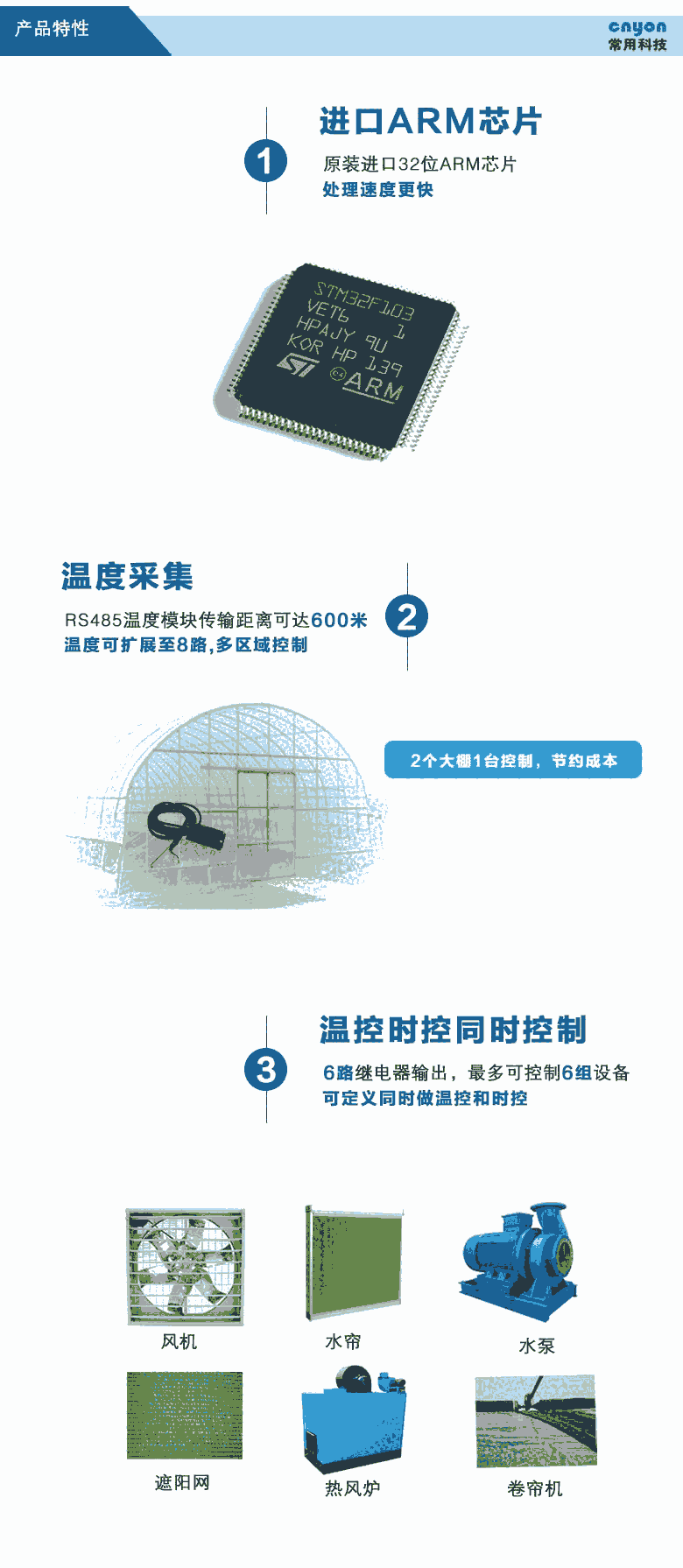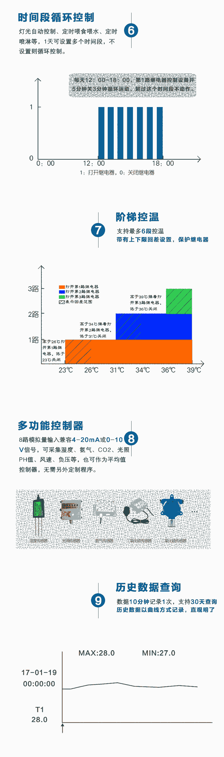 升级版IL系列微电脑智能控制器通过高精度探头采集环境中各项参数,经过控制器的逻辑运算,自动控制升温、降温、加湿、除湿、通风等设备,从而使环境保持在一种恒定的状态,当环境异常,及时报警,适用于农业生产(大棚温室、畜牧养殖、食用菇房、自动灌溉、花卉培育),暖通系统(冷库冷藏、档案馆、博物馆、通讯机房等)、科学实验、工业过程(厂矿、车间)控制等领域。