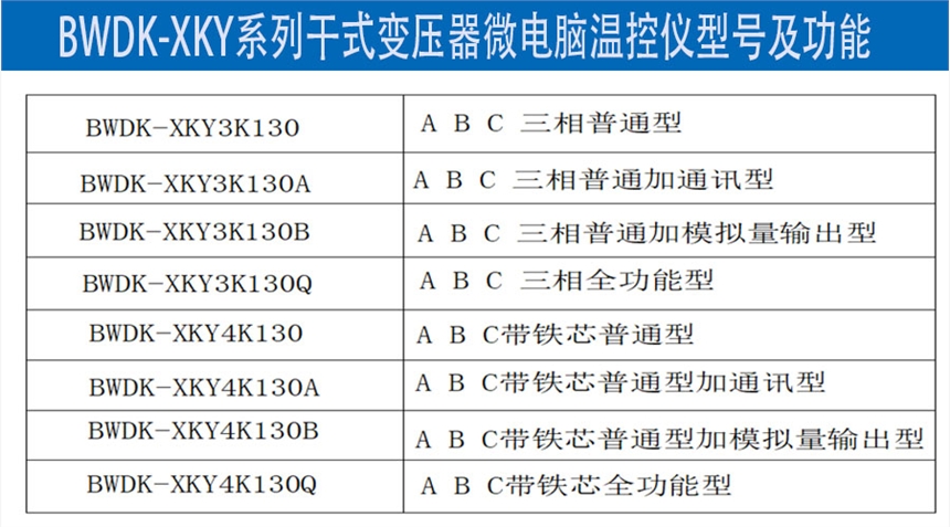 BWDK-XKY3K130干式变压器微电脑温控器(简称干变温控)是我公司为风冷干式电力变压器可靠运行而设计的新一代多功能型微电脑温控仪。利用预埋在干式电力变压器三相(或铁芯)绕组线包中的三只(四只)NTC铂热电阻来检测干式电力变压器线包的温升,并根据温升自动控制冷却风机的启停、超温报警直至超高温跳闸以保证干式电力变压器的安全运行。由于采用目前先进的RISC单片计算机并结合先进的I2C存储与调整技术,根据JB/T7631标准设计而成,使得温控器具有结构简单,运行可靠,抗干扰能力极强的特点。同时温控器还具有“黑匣子”功能,可记录停电时三或四个绕组包的温度及本机的工作状态。在抗干扰方面,本仪器在设计上优化了抗干扰措施,同时可运用软件实时监控温控器的工作状态。在使用方面,本仪器还具有操作简单、安装方便、维护容易的特点。