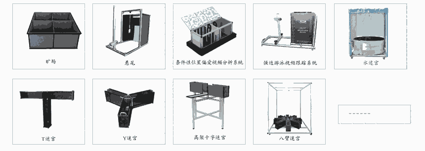 黑白箱实验分析系统、悬尾实验视频分析系统、大小 shu 步态行为分析系统、高架十字迷宫分析系统、强迫游泳实验视频分析系统、动物三箱社交行为分析系统、洞板系统、疼痛自动分析系统、 Y迷宫视频分析系统、八臂迷宫实验视频分析系统、穿梭实验视频分析系统、T迷宫视频分析系统、Morris水迷宫系统、Barnes巴恩斯迷宫视频分析系统、新物体识别实验系统、条件性位置偏爱视频分析系统