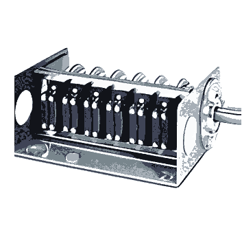 旋转凸轮开关 GSW100E 通常有 4、8、12、16、20和28个开关元件。凸轮轴(主轴)从两侧出来外壳,以便多个开关可以耦合在一起。第二个结束通常不用的轴由安全盖保护。透明的安全盖下面有一些刻度环的索引标记。凸轮轴安装在两个深沟球轴承中,免维护。为了驱动各个开关元件,凸轮轴上装有开关鼓 - 与其他带有至少 180°凸组的旋转凸轮开关相反。这些开关鼓的新设计由塑料鼓组成薄钢箔,可以根据需要伸展或缩回。开关鼓以 15 mm 的间距排列。因为与旋转凸轮相比,间距从20毫米减少到15毫米切换GSW100和GSW100M,相同大小的切换点数可以增加住房。