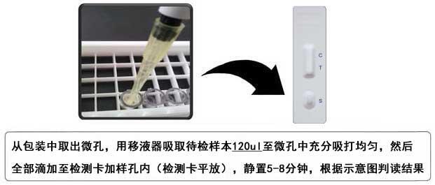 3、用铝箔袋中配套滴管吸取上述按不同比例稀释后的待检液120微升(约4滴)于金标微孔中,用配套滴管轻柔吹打30秒,完全溶解金标微孔底部红色物质,水平静置,等待反应2分钟,吸取金标微孔内红色溶液,轻柔吹打10秒后,全部滴加到检测卡加样孔(S)中,加样后开始计时。