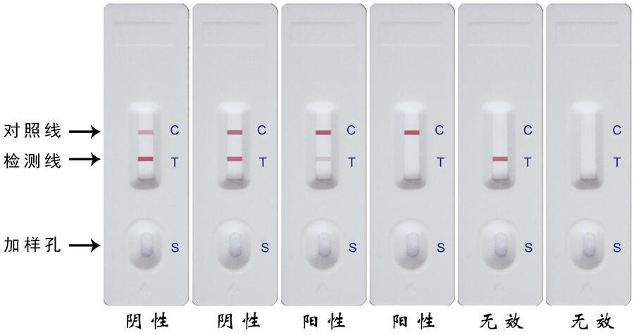 无效:质控区(C)未出现紫红色条带,表明不正确的操作过程或检测卡已变质损坏。在此情况下,应再次仔细阅读说明书,并用新的检测卡重新测试。如果问题仍然存在,应立即停止使用此批号产品,并与当地供应商联系。