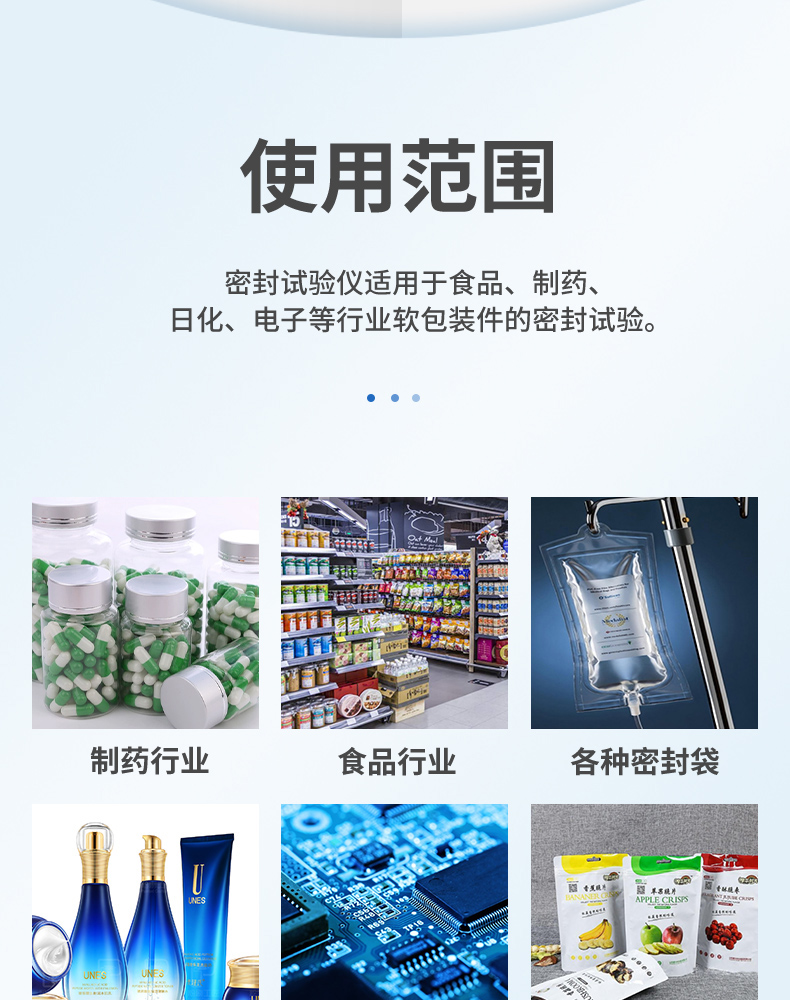 ZC-03A泄漏与密封强度测试仪专业适用于各种热封、粘接工艺形成的软、硬金属、塑料包装件、无菌包装件等各封边的封口强度、蠕变、热封质量、以及整袋胀破压力、密封泄漏性能的量化测定,各种塑料防盗瓶盖密封性能、医用湿化瓶、金属桶及封盖的量化测定,各种软管整体密封性能、耐压强度、帽体连接强度、脱扣强度、热封边封口强度、扎接强度等指标的量化测定;同时也可对软包装袋所使用材料的抗压强度、耐破强度等指标,瓶盖扭力密封指标、瓶盖连接脱扣强度、材料的应力强度、以及整个瓶体密封性、抗压性、耐破性等指标进行评估分析。
