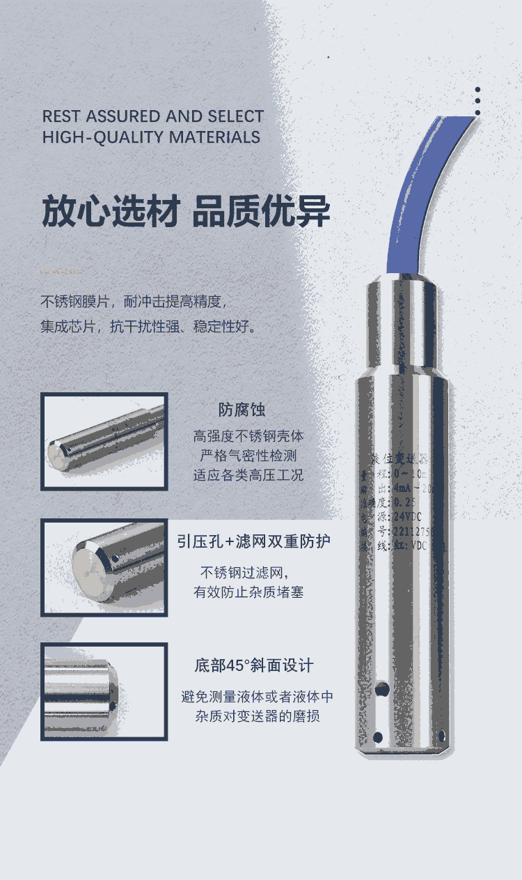 04)投入式液位变送器安装时,金属探头要沉入容器底部。