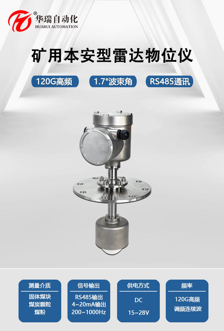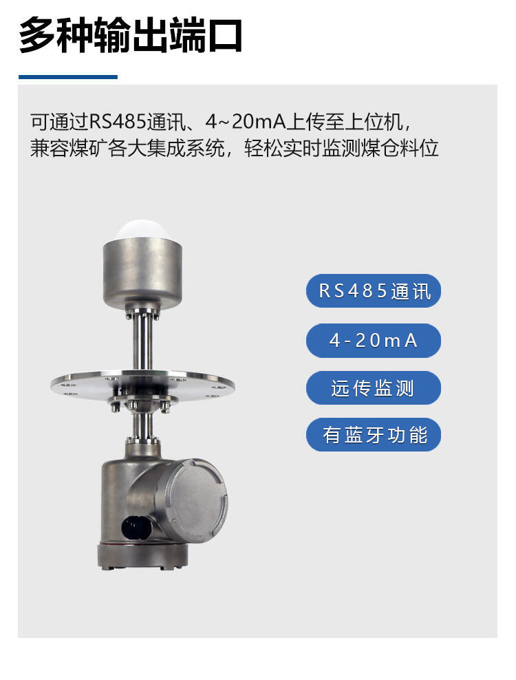 非接触煤仓仓位计、煤安认证、实时测量、多种输出高精度矿用雷达物位计物位传感器属于矿用本安型设备,主要用于煤仓的仓位测量,可现场显示并具有丰富的模拟和数字接口,可供PLC/DCS等采集,以达到准确实时监测煤仓煤位高度和控制煤仓运行的作用。