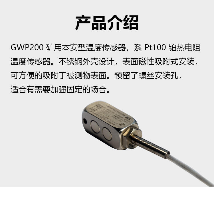 煤安认证 高精度 可定制矿用本安型磁吸式温度传感器GWP200 PT100采用表面磁吸式,可直接吸附在被测部位的表面,安装灵活,产品自身且带有螺丝孔,对于有些不便于吸附的设备表面则可采用螺丝来固定,从而达到测温的目的。我们产品通过了煤安认证,确保在煤矿等高风险场所的安全使用。安全始终是我们的首要考虑,因此我们严格遵循煤矿监察部门的标准和要求,确保产品的质量和稳定性。