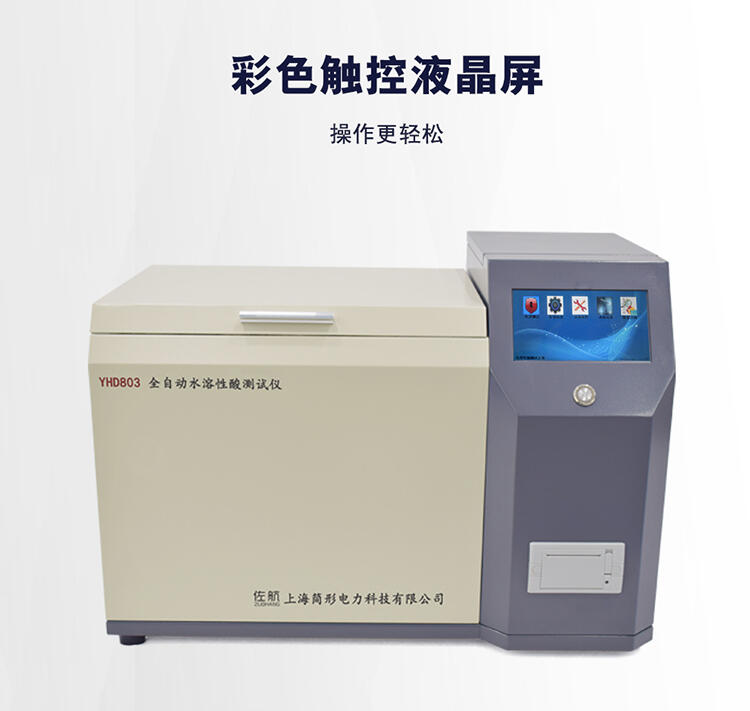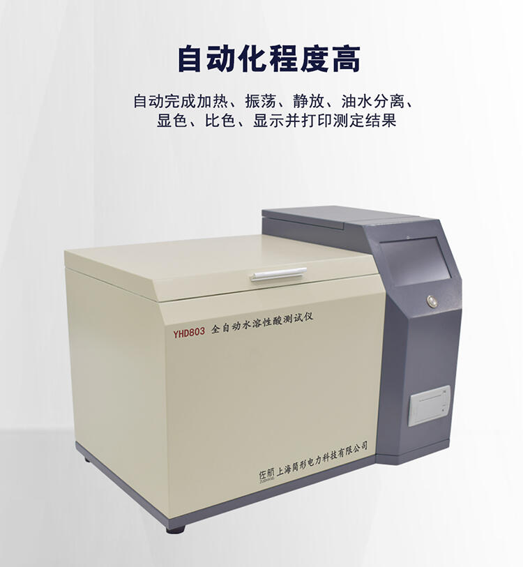 佐航YHD803全自动水溶性酸测试仪(比色法)是根据中华人民共和国国家标准GB/T7598-2008运行中变压器油水溶性酸测试法及相关标准设计制造。采用大屏幕液晶显示,利用微处理器控制,可以根据用户的设定条件自动完成加热、恒温、振荡、取样、测试、清洗、打印等功能,可以一次性测量1-6个样品,大大缩短了用户的测试时间。