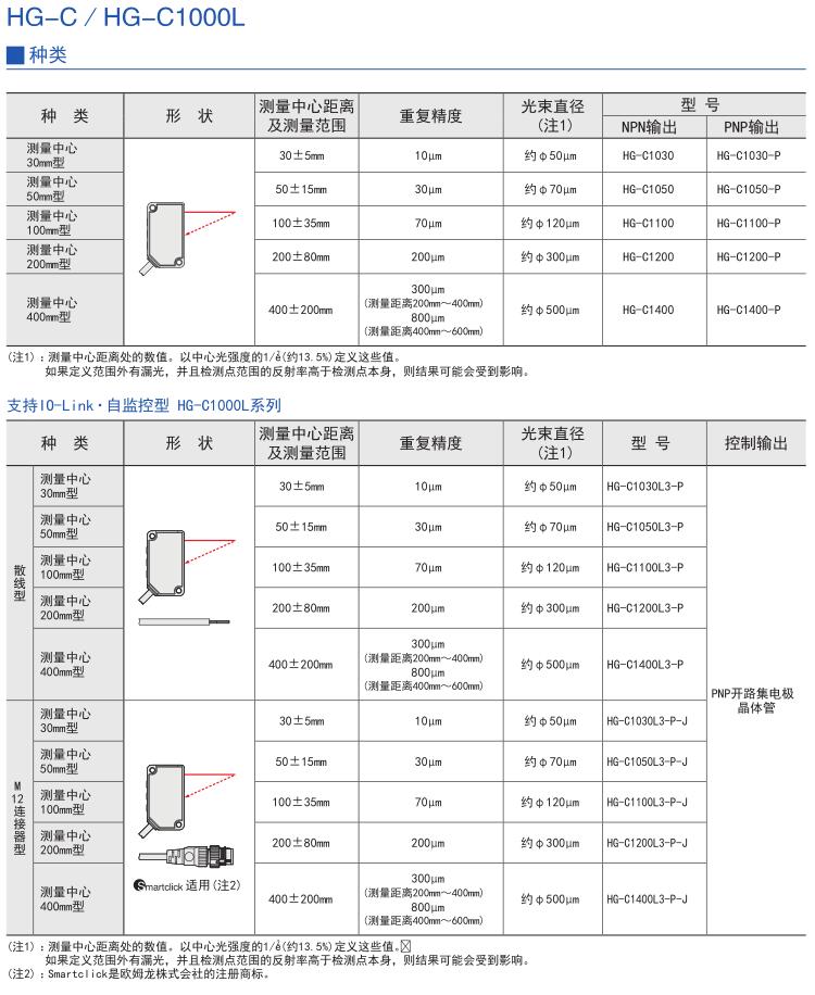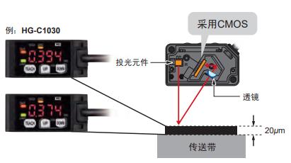 一般通过延长受光部分与受光元件(CMOS)之间的光路长度,从而可获得精度更高、更稳定的测量值,但是另一方面,传感器的进深方向会变长,机身形状也会变大。HG-C系列设计出内部设置反射镜的新型光学系统,并缩短进深方向的尺寸,同时又可实现与变位传感器相媲美的高精度测量。