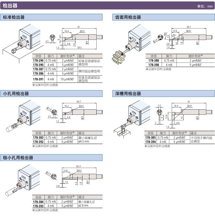 除标准检出器外,还备有小孔用、极小孔用、齿面用、深槽用检出器选件。