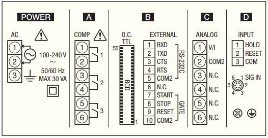 出力仕様 1组闭合接点输出(机械式继电器) COMP1、COMP2、COMP3的输出 最大接点容量 DC 30 V / 1 A, AC 250 V / 1 A |