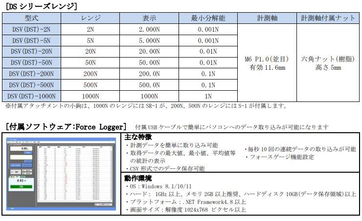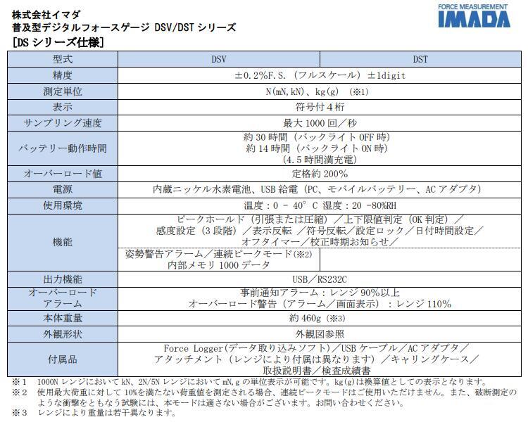 DSV系列是多功能测力计,涵盖从2N到1000N的测量范围。握在手中时,姿势变化警告功能可提高重现性。数字测力计旨在提高手动测量时的再现性。这是在DST系列的基础上增加了功能的高端型号。手动测量时,测量角度不如机器测量一致,且重复性有限。但是,如果在测量过程中检测到倾斜,该数字测力计会发出警报。这可以记录为数据中的“异常”。此功能减少了测量角度的变化并提高了再现性。此外,它还配备了无需按按钮即可连续获取峰值的功能以及内部存储器等便利功能。某些功能可能需要连接单独销售的相关产品。