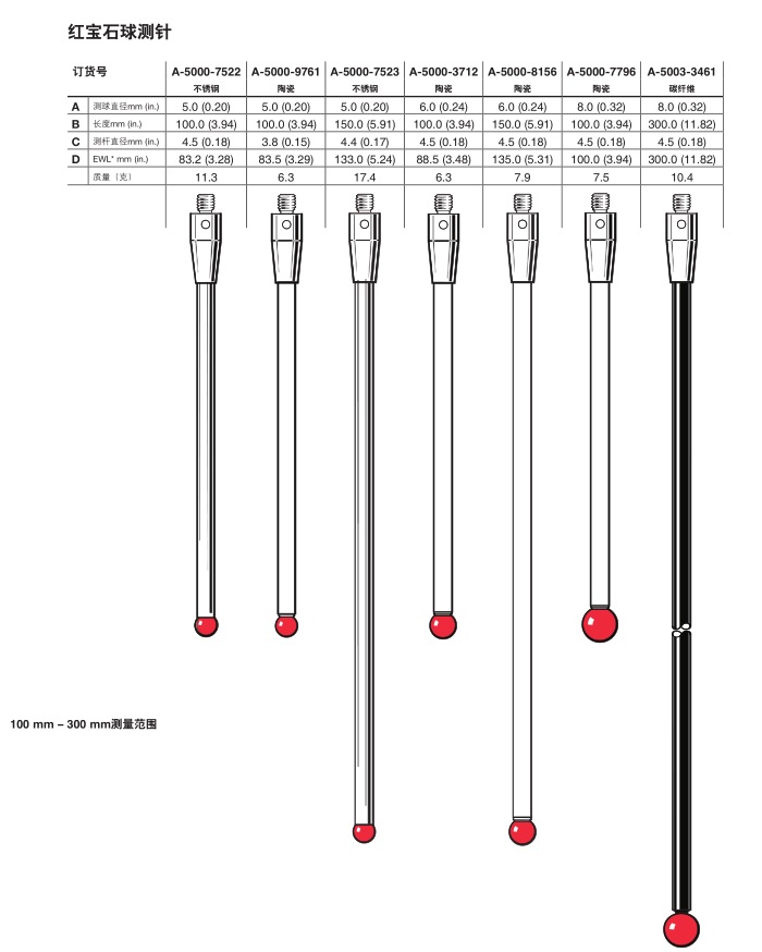 测球安装在一系列材料的测杆上 — 不锈钢、碳化钨、陶瓷及专用碳纤维材料“雷尼绍GF”— 这种简单的红宝石球测针适用于大多数检测应用场合中。