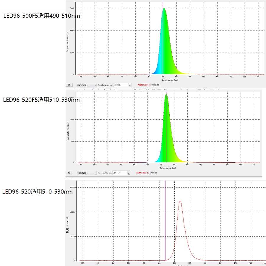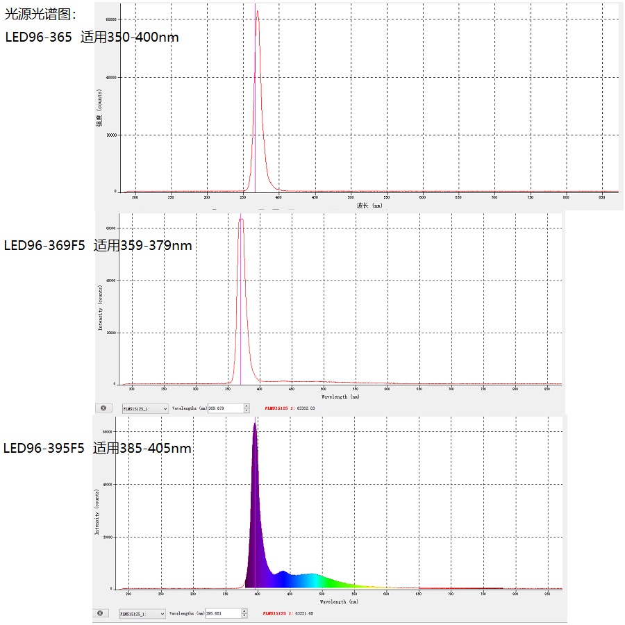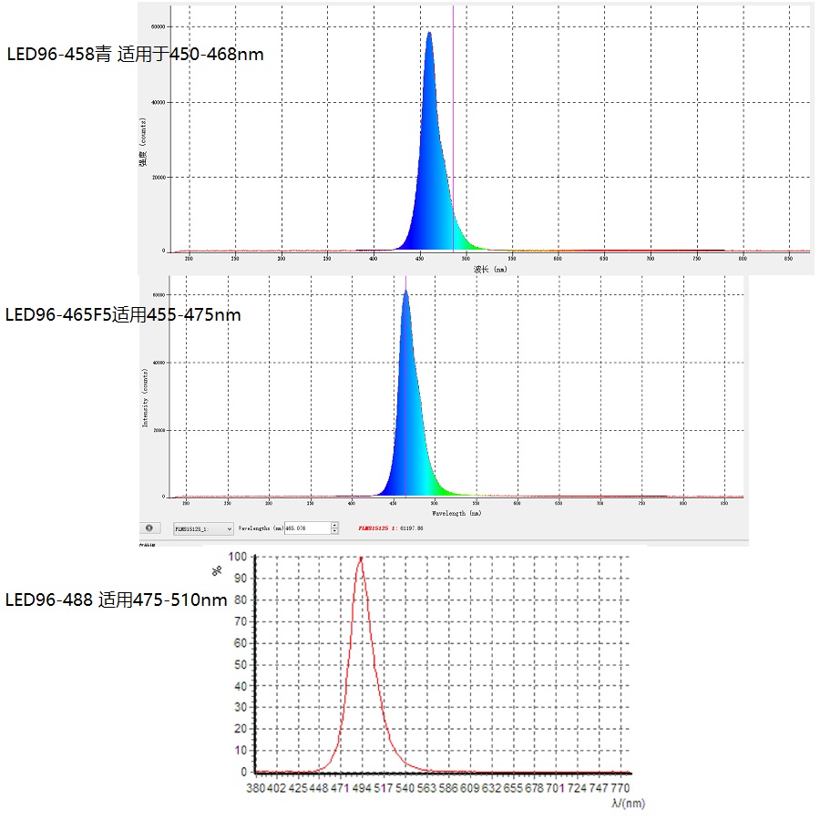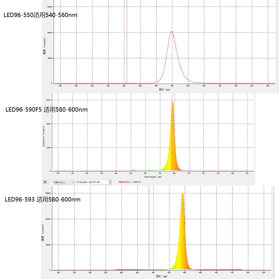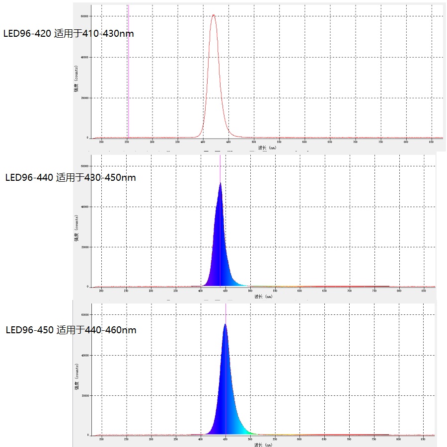 365nm、369nm, 395nm,405nm、410nm、415nm、420nm, 440nm、450nm、458nm青、465nm,488nm、500nm、520nm,550nm、590nm,593nm、620nm,635nm,660nm,740nm、808nm,850nm、940nm白光 ,可见光,(常用半峰宽+-10nm,比如465nm适用于455-475nm); |