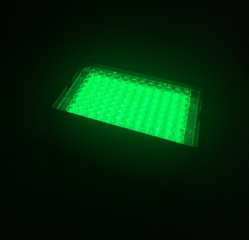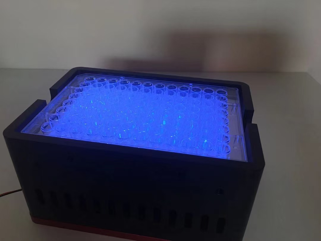 本产品是专门针对评价光敏剂和光热材料而推出的LED光源的体外细胞光毒性照射机,其体积小巧,与标准96孔细胞培养板配合。为药物作用于细胞及微生物的光毒性效应提供光源和效应场所。区别于传统光毒性照射仪的点光源,本款产品采用LED面光源,发光均匀,实现对所有细胞培养孔的均匀照射,减少了平行试验次数,可以增加科研工作者们的实验效率。除此之外,产品还具有发光强度可调,可定时控时,波长或发光位置可预先定制,灵活便捷等特点,并配有亚克力灯罩保护操作者的眼睛。