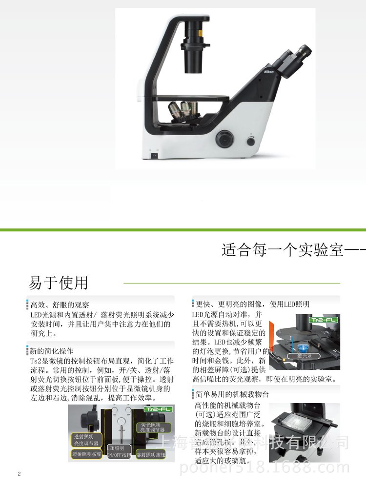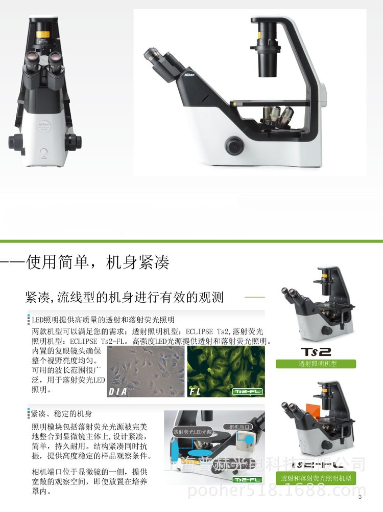 镜筒 Ts2和Ts2-FL:俯角:45度;瞳距调整范围:50-75mm,Siedentopf型;可附加相机端口;目镜/端口:100/0:0/100