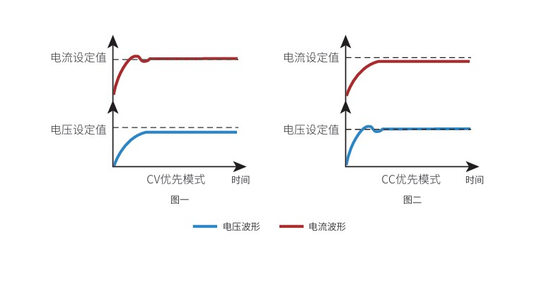 如图一, 当待测组件在测试过程中需要减少电压过冲的情况下,如给DC-DC电源模块供电时,应使用电压优先模式以便获得快速而又平稳的上升电压。