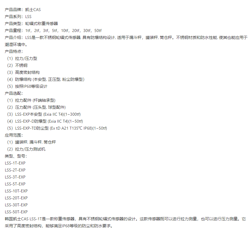 韩国凯士CAS LSS系列称重传感器是一款专为罐装秤、漏斗秤和筒仓秤设计的拉力/压力型传感器,具有以下核心特性: