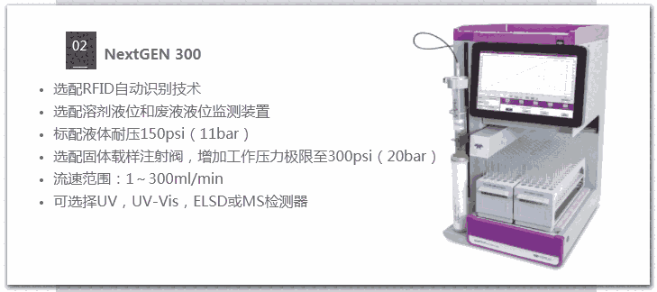 CombiFlash NextGEN仍然拥有CombiFlash系统的所有功能,包括RFID识别柱和支架、溶剂和废流量感知、优化的分离条件,以及可自动清洗的固体装载的注入阀。NextGEN拥有更大的触摸屏、更高的zui大流速和压力、UV检测与增加的动态范围,以适应更高的样品负载,更新的峰值控制与新方法,以加快纯化过程而不影响纯度。