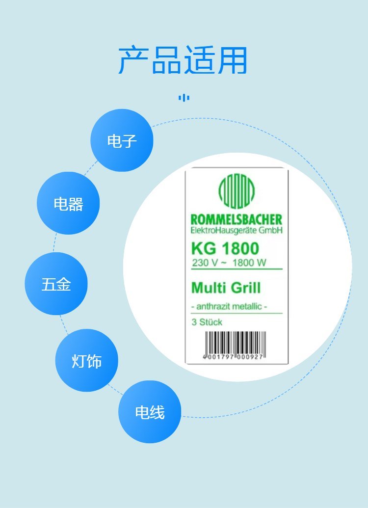 用途范围 | 电子/电器/五金/灯饰/朔胶/电缆电线/插头 | ||