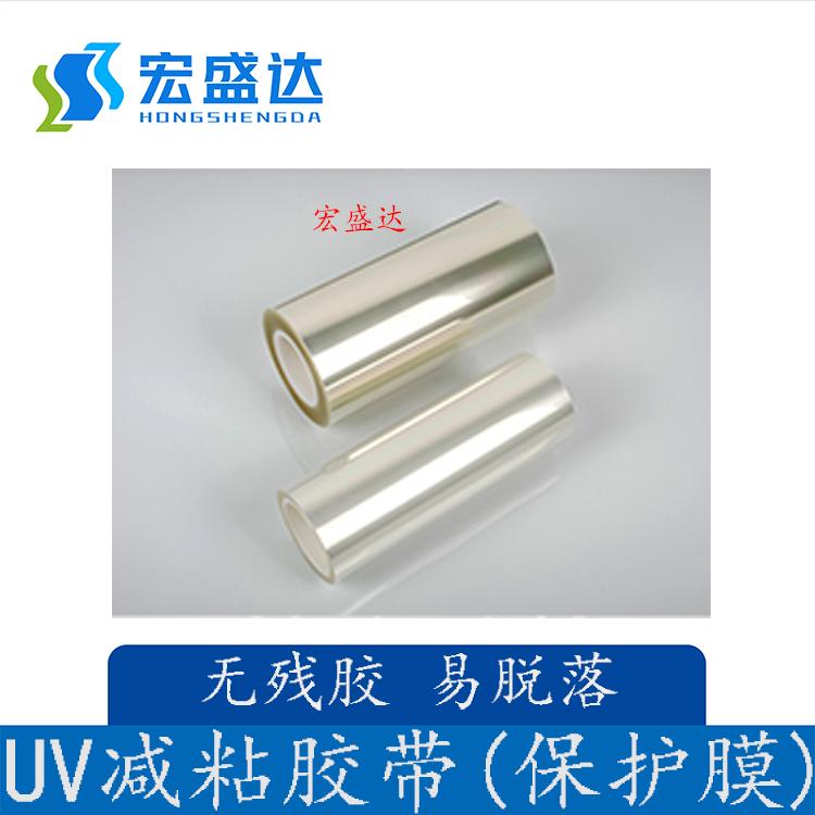 ???UV 减粘膜又称 UV 失粘胶带,或 UV 减粘胶带。由 UV 减粘胶水涂布在特殊的薄膜上面形成的 UV 减粘胶带。常态下显示高粘力(10~20N/inch),但是经过紫外线照射后粘接力急剧下降(0.5N/inch 以下)的减粘胶带。基材通常分为PO及PET两款,不同基材及不同厚度生产出来的UV减粘胶带(保护膜),能够实现不同客户的初始粘接力高粘及末端工作的减粘要求。