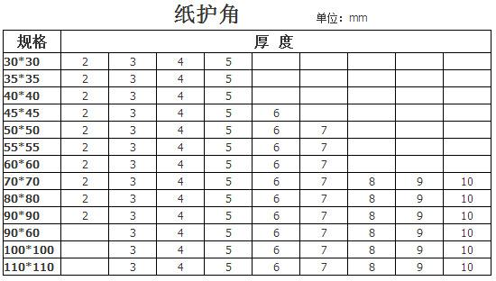 纸护角规格边宽30——100mm;厚度3——10mm之间任意规格的纸护角,根据您的需要,可为客户量身订做不同规格不同宽度和厚度的L型、U型、环绕型、90度折弯型、带锁扣型、异型等多种型号纸护角,满足您的产品的各种包装需求。我们的产品具有表面光滑平整,无毛刺,不起层,不开裂,硬度强度都可以,防撞, 保护产品在运输过程中使货物受到保护,防止货物受到撞击变形。欢迎您的来电咨询