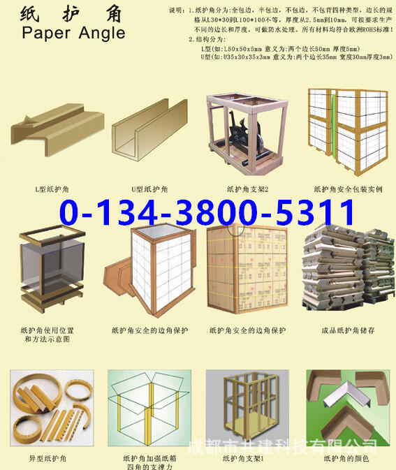 2、预防外部损害,若使用纸护角仅是为了保护表面,而不需要加固时,厚度有3mm即可,其尺寸可按货物的尺寸来确定,为降低成本,还可以用一些小的护角保护因打包带过紧的边角损坏。