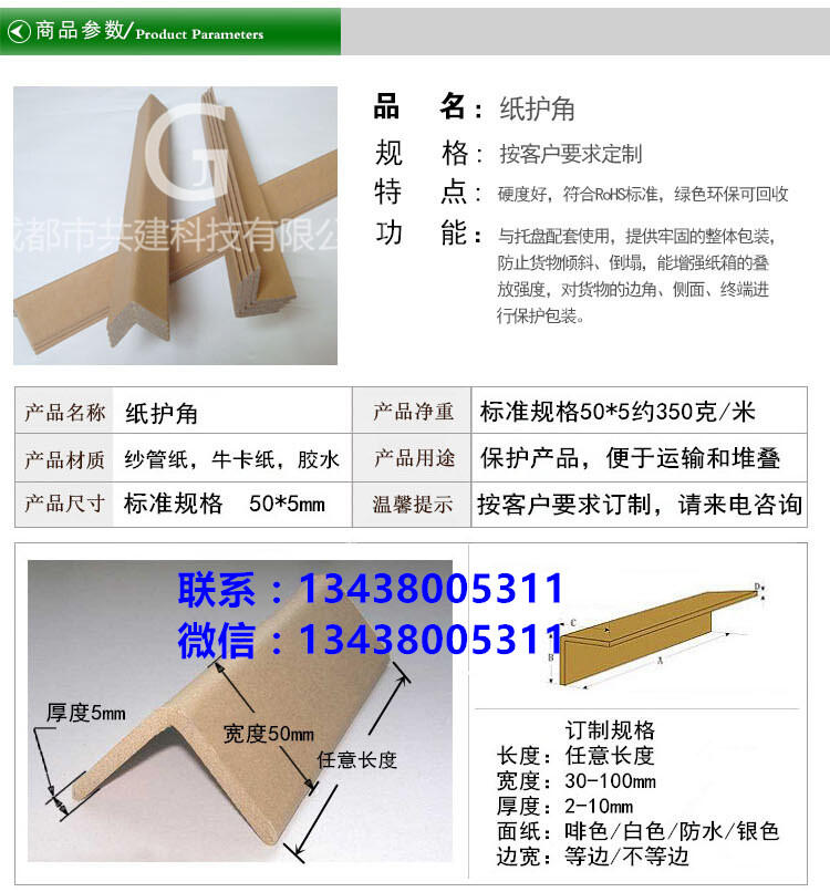 纸护角规格边宽30——100mm;厚度3——10mm之间任意规格的纸护角,根据您的需要,可为客户量身订做不同规格不同宽度和厚度的L型、U型、环绕型、90度折弯型、带锁扣型、异型等多种型号纸护角,满足您的产品的各种包装需求,我们的产品具有表面光滑平整,无毛刺,不起层,不开裂,硬度强度都可以,防撞, 保护产品在运输过程中使货物受到保护,防止货物受到撞击变形。欢迎您的来电咨询